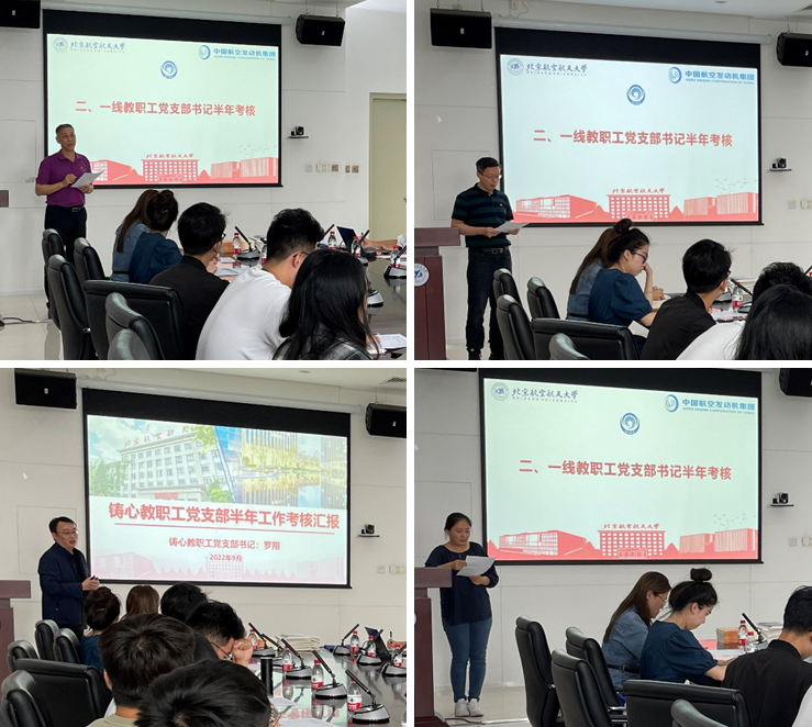 在欢迎新成员后,王文文介绍了航发院党委组织架构与基本情况。接着,开展一线教职工党支部书记半年工作述职和考核。教职工强心党支部书记陈志英、教职工铸心党支部书记罗翔、压气机气动设计师生党支部书记刘宝杰、安全性与适航师生党支部委员刘晓静(代支部书记)分别就已开展工作、现存问题、下一步工作计划开展汇报,并分享了支部成员讲党课、发挥支部战斗堡垒作用、凝聚群众、党建业务融合等特色工作,为其他支部开展相关工作提供经验。工作汇报后,与会成员对述职情况进行评价。