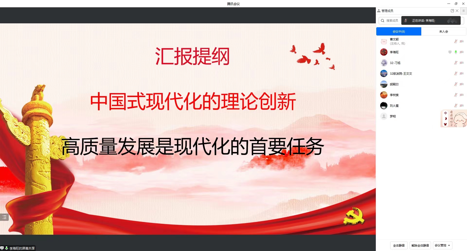 航发院党委委员、副院长李海旺以“中国式现代化是强国建设、民族复兴的康庄大道”为题作重点发言。他细致阐述了中国式现代化提出的“五个中国特色”“九个本质要求”“五个重大原则”“六组重大关系”,通过与西方现代化的对比,进一步分析了中国式现代化的理论创新;从“高水平社会主义市场经济体制”“现代化产业体系”“质、量并重”“促进区域协调发展”“创新驱动发展”“高水平对外开放”六个方面,结合航发院科技创新、质量体系建设与完善等工作,深入阐明了高质量发展是中国式现代化的首要任务。指出,航发院要深刻理解并运用好中国式现代化理论,将推动高质量发展作为绘就新画卷的关键画笔,为我国航空发动机事业和中国式现代化建设做出应有贡献。
