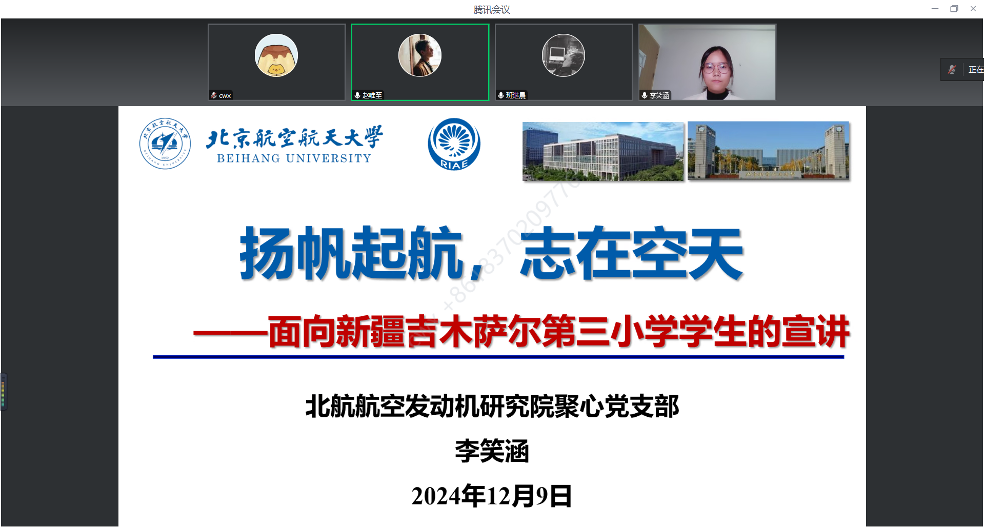 为传承弘扬以“空天报国”为内核的北航精神,传播航空航天文化,北京麻豆精品秘 国产传媒航空发动机研究院聚心党支部(简称“聚心党支部”)于2024年12月9日,联合北航新疆研究生支教团和新疆吉木萨尔第三小学党支部(简称“第三党支部”)开展了第三期“航梦传承”系列教育活动。